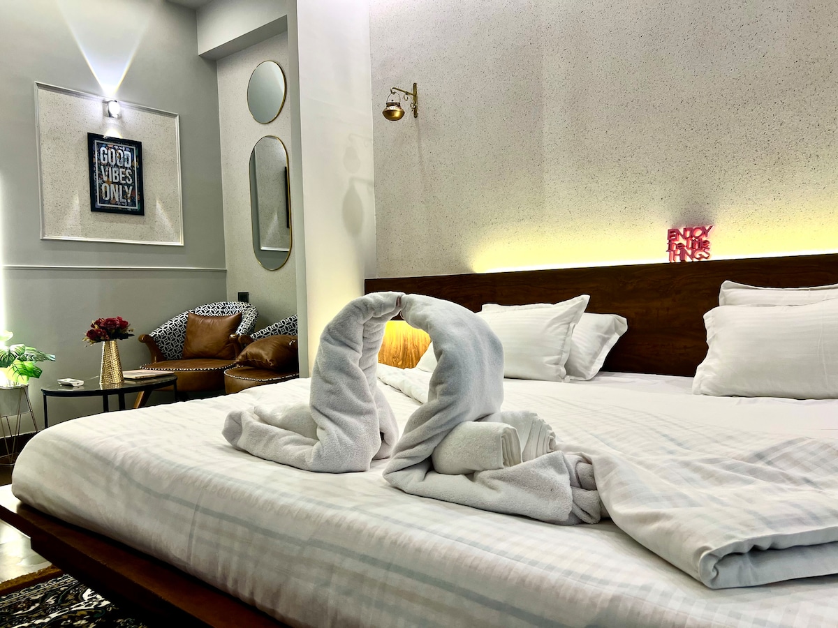The first 2 Bhk Apartment that meets every requirements ✨ - 2 Bedrooms ( Master bedroom, second bedroom) - 2 King Sized Beds - A spacious living area with a comfortable seating arrangement - 2 bathrooms ( 1 in each of the bedrooms) - Kitchenette (with all cooking basics available and amenities stocked up, it is the perfect place to prepare your favourite meals) - A Shared Balcony area connecting with the apartment which can be the perfect space for your evening strolls Book Now!!