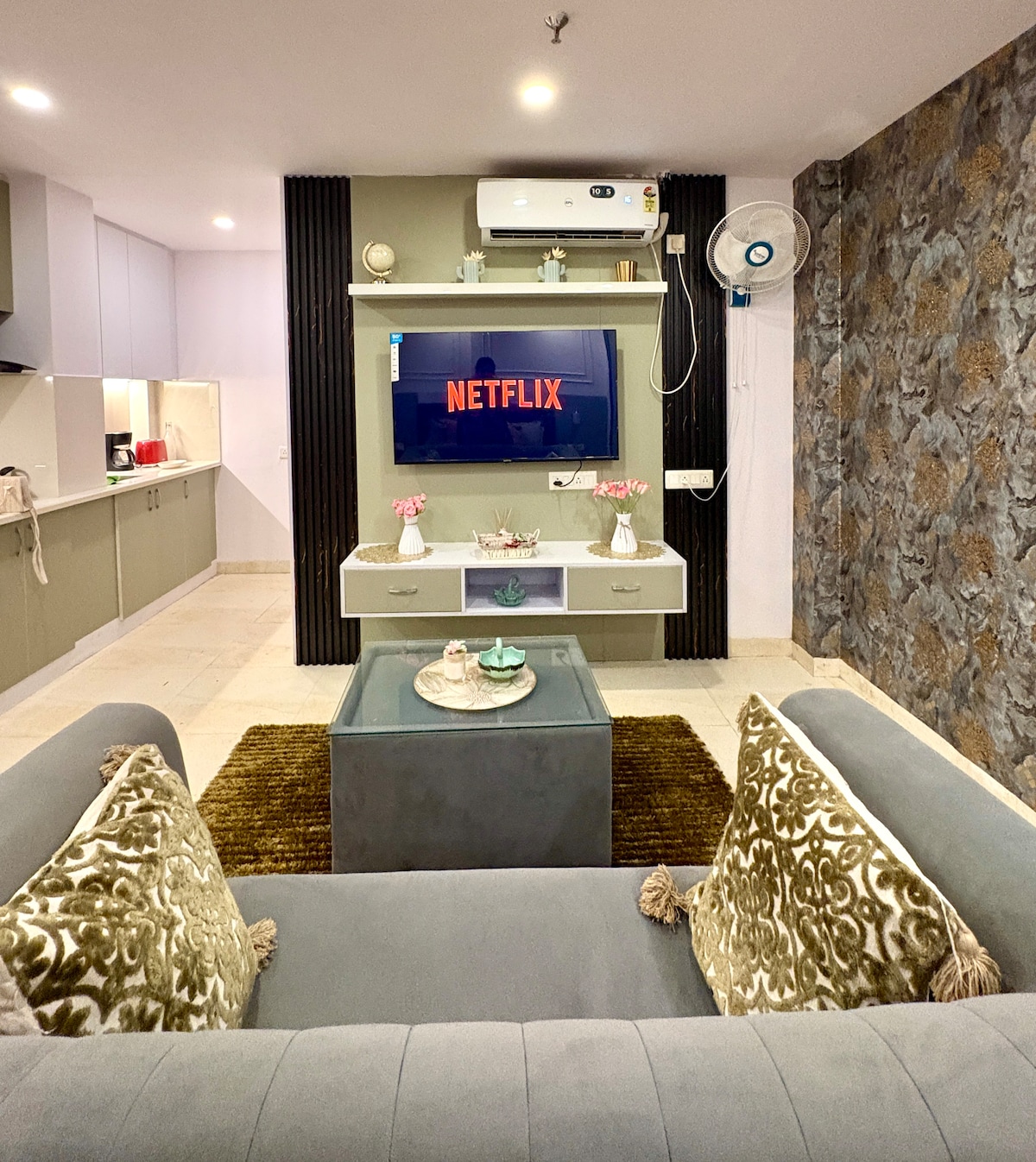 Aqua Pebble Stay blends calming aqua tones with elegant grey textures to create a space that feels fresh, modern, and quietly premium. Designed for comfort and ease, the home offers a cozy sleeping area, a relaxing living space, and all essentials for a smooth stay. Soft lighting, airy interiors, and thoughtful styling give it a serene coastal touch with a contemporary feel. Ideal for couples, solo travelers, and work-friendly stays seeking peace, style, and comfort in one place.