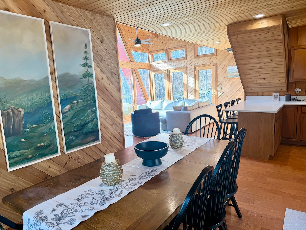 Этот дом в форме буквы А, расположенный в лесу с видом на озеро Фоксфайр, предлагает идеальный отдых в любое время года. Когда выпадает снег, он превращается в типичное зимнее убежище. Уютно расположитесь у каменного камина, где вид на озеро обрамлен замерзшими деревьями. Когда погода становится теплее, озеро зовет! Наслаждайтесь прямым доступом к озеру Фоксфайр с нашего частного дока. Проведите дни, ловя рыбу, плавая или просто греясь на солнце. Это шале поможет вам найти радость и отдых в любое время года.