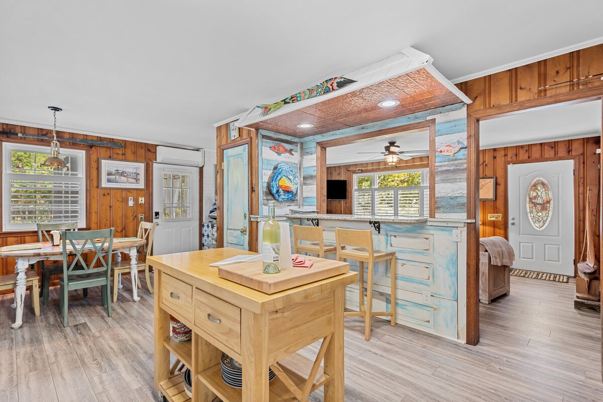 Это частное бунгало в морском стиле площадью 544 кв. фута имеет одну большую комнату с открытым спальным лофтом (2-я спальня) с видом на главный этаж. На первом этаже есть два кресла-качалки, диван, кровать размера Queen size, телевизор, обеденный стол. В лофте есть двуспальная кровать и односпальная кровать. Идеально подходит для 4 гостей, но вмещает 5. Мини-кухня имеет основные принадлежности (микроволновую печь, тостер, кофеварку Keurig, небольшой холодильник), но не оборудована для приготовления пищи. Внеуличная парковка и место для лодочного прицепа. Животные и курение запрещены
