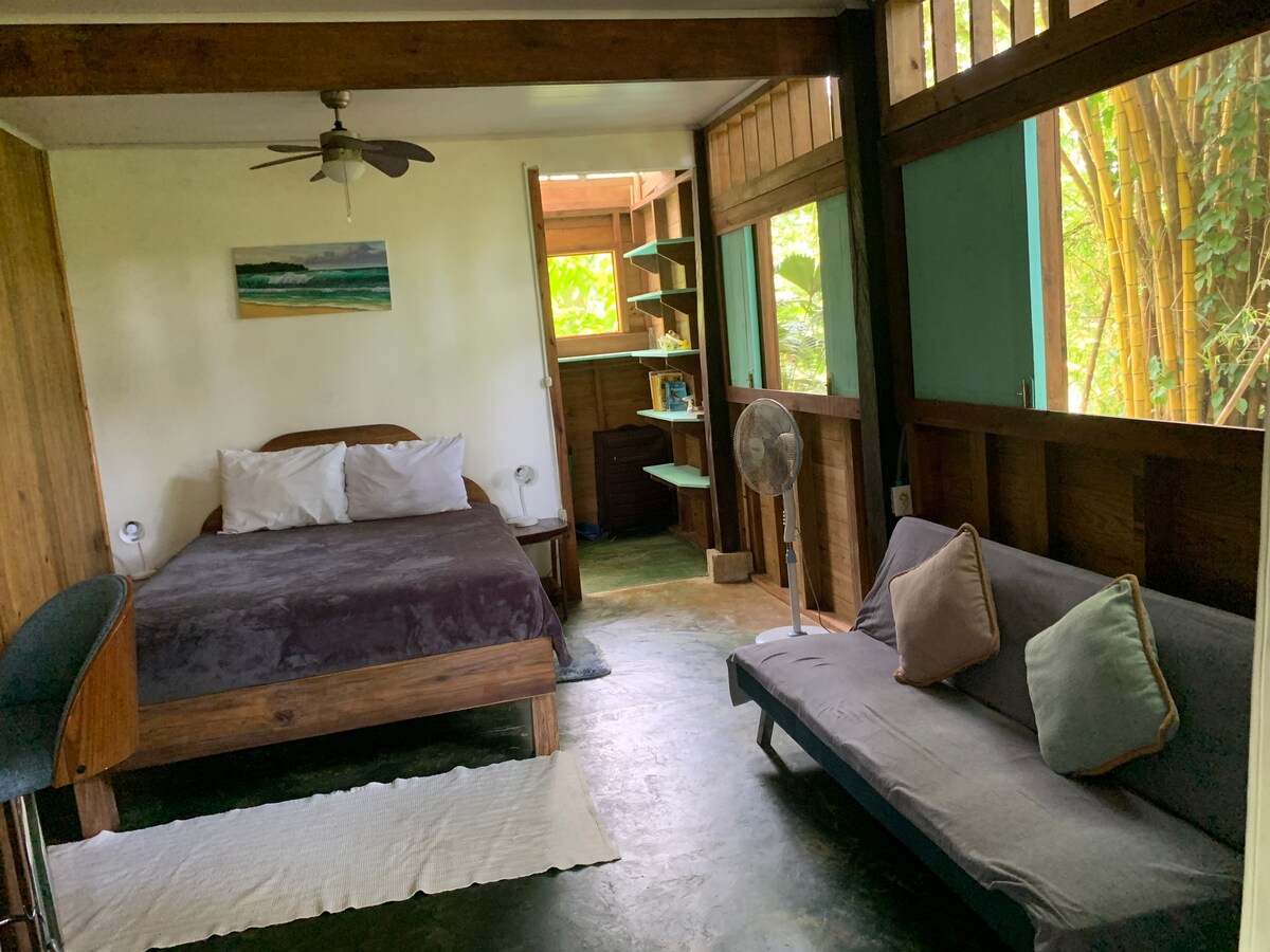 Никаких сборов за услуги! Расслабьтесь в нашем спокойном отдыхе на острове, расположенном прямо над Карибским бассейном. Жилье расположено на холме с видом на океан, где вы будете спать под звуки волн и джунглей. В апартаментах есть кровать размера Queen size, собственная ванная комната и открытая мини-кухня. Наше расположение позволяет вам оказаться в самом центре собственного приключения. Прогуляйтесь по джунглям к волнистым пляжам или Старому берегу. Мы находимся в 5 минутах езды на лодке до ресторанов и клубов города Бокас. *Все наше жилье запрещено КУРИТЬ.*