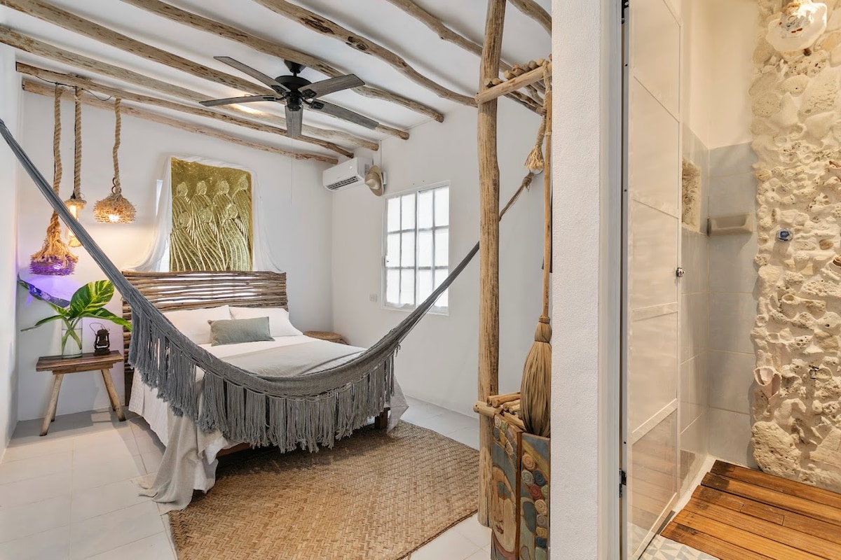 Beautiful luxury house with Mayan and hardwood style. A authentic Prehispanic experience. The suite has a equipped kitchen , bathroom, bedroom with smart TV ,and closet, private terrace and garden and a large shared pool chlorine free. Hermosa suite de lujo con acabados en maderas preciosas y estilo Maya. Una autentica experiencia mexicanca estilo prehispanico. Cuenta con cocina equipada,baño completo,recamara con Smart TV y closet,terraza y jardin privados y gran alberca sin cloro , compartida