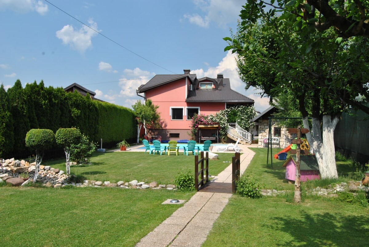 This duplex consists of two full apartments, one on the first floor and one on the second, with a Game Room on the ground floor. It has 5 bedrooms, 2 living rooms, 2 kitchens, 3 bathrooms and can comfortably sleep 13 people. This includes 2 queen size beds, 5 single beds, and 4 couches that pull out to double beds. The outdoor space has tree swings, covered seating, Weber gas grill, and even a small veggie garden and raspberry bushes. Very close to Bosna Springs Park and River Zeljeznica.