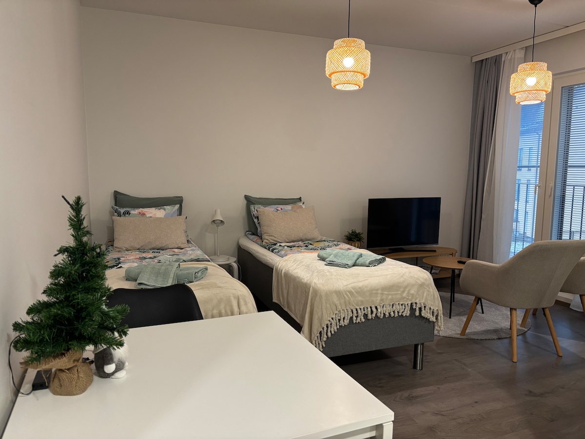 Студия с сауной и балконом, расположенная недалеко от центра города. Кровати для четырех человек. Двуспальная кровать и диван-кровать. Кровати застелены, полотенца включены. Используйте моющие средства без ароматов. В шкафу есть основные принадлежности для завтрака. Кофе, чай, каша, мюсли и т. д. можно найти в шкафу. Бесплатная парковка перед домом. Курить в квартире запрещено. В квартире есть настольный вентилятор. Прибытие с помощью мини-сейфа. В кондоминиуме тихо, так что вы можете отдохнуть.