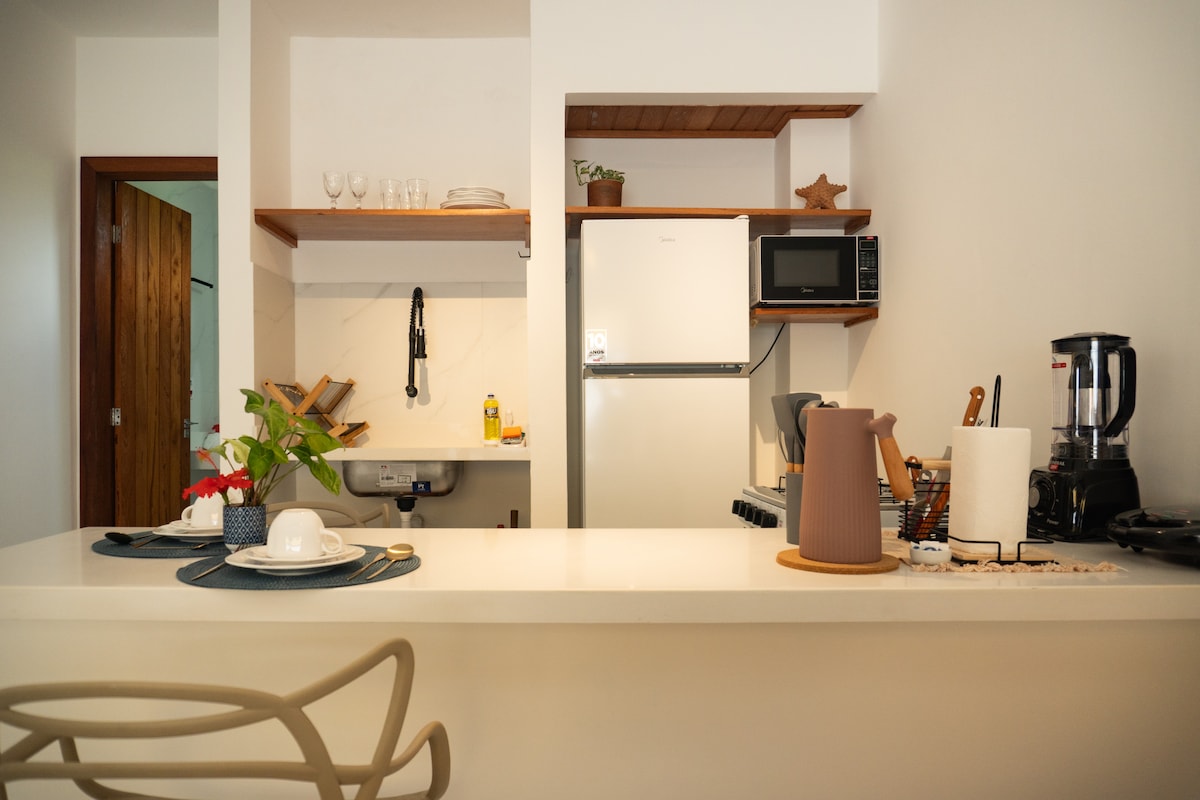 Nossos Flats são equipados com: Quarto - Cama de casal - Guarda-roupas - Ar Condicionado e Ventilador de Teto - Travesseiros, cobertor e roupa de cama Banheiro Privativo - Chuveiro quente - Toalhas de Banho e de Rosto - Sabonete e papel higiênico Cozinha - Utensílios domésticos (copos, panelas e talheres) - Geladeira, fogão e liquidificador - Pia e armários de cozinha - Mesa para refeições com 4 cadeiras Sala - Smart tv grande com canais à cabo - Sofá cama (que pode acomodar 2 pessoas)
