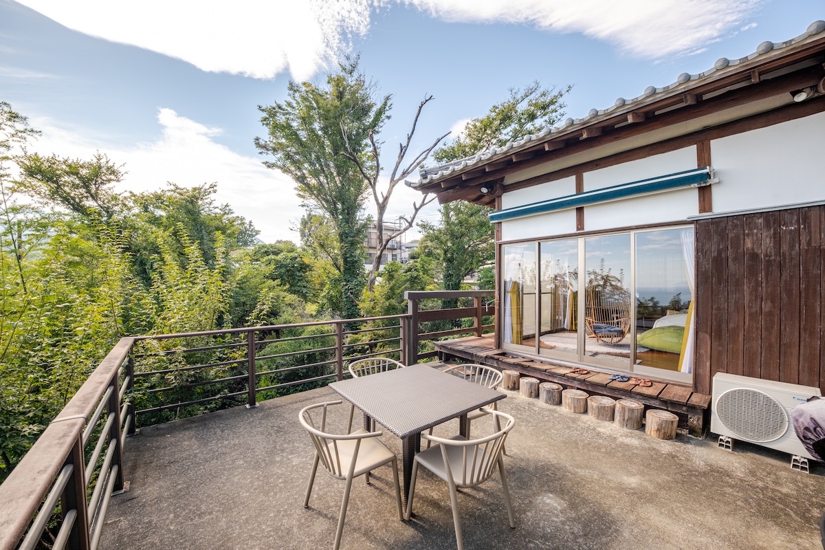 箱根湯本から一駅。大正〜昭和の家具に囲まれた、緑香るウッドテラスのある宿。高台から小田原の街を一望
