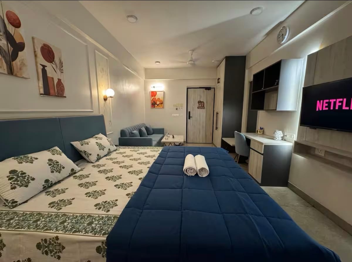 Остановитесь в нашей роскошной студии в The Grand Anukampa, лучших апартаментах Джайпура. Наслаждайтесь кондиционером, Wi-Fi, мини-кухней и ванной комнатой, а также видом на террасу и спокойным уголком для чтения. Благодаря доступу к бассейну на крыше, тренажерному залу, спа-салону, детской игровой комнате, клубу и ресторанам, включая Rawat Misthan Bhandar, ваше пребывание сочетает в себе комфорт, стиль жизни и удобство в оживленном центре Розового города. Идеально подходит для пар, деловых поездок или длительного проживания.