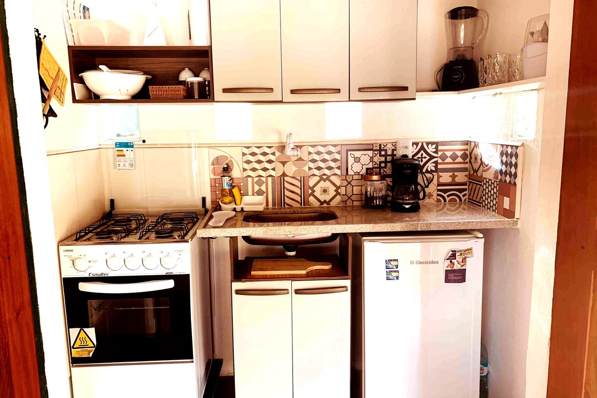 Квартира для 2 человек: кондиционер кухня оборудована; 1 кровать размера Queen size домашний офис в помещении Wi-Fi + телевизор с потоковым видео Постельное белье с полотенцами предоставляется ванная комната Общий пляжный набор: 1 зонтик 1 термальная коробка 1 портативный барбек 2 шезлонга; Общая зона обслуживания: стиральная машина, варал и танк Общая зона: душ на улице Вы можете припарковаться бесплатно перед квартирой Ваш питомец приветствуется за плату за уборку. Все розетки 220 В.