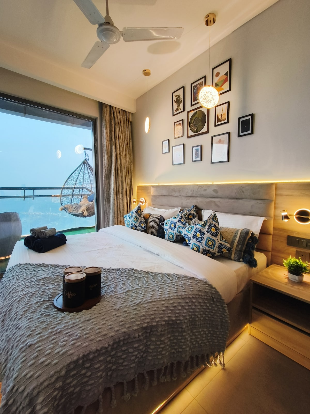 ➽ Spacious 1BHK apartment with an attached patio, fully air-conditioned. All rooms have 1.5-ton ACs. ➽ Sun-facing property in a high-income neighborhood, three-side open, park-facing, and well-ventilated with ample natural light and fresh air. ➽ High-end projector with 25W soundbar and Amazon FireStick with OTT apps. ➽ Fully equipped kitchen with essentials for convenient cooking. ➽ Relax on the stunning private terrace patio with ambient lights and unique Foger system for cooling the patio