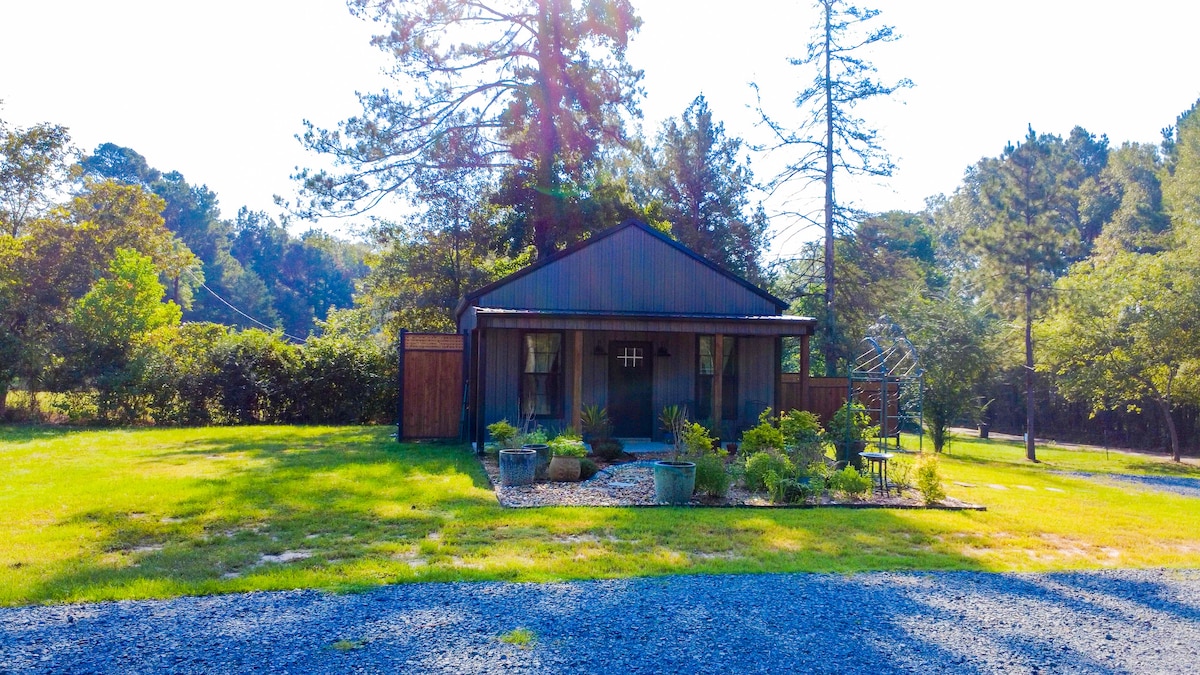 Коттедж расположен в соснах в 20 футах от главного дома. Двухэтажный коттедж площадью 800 кв. футов с охраной и белыми огнями от главного дома для света... Эклектичный стиль со сводчатым потолком в большой спальне наверху. Внизу - в гостиной/мини-кухне есть телевизор и диван-кровать. *Примечание. Одна ванная комната в коттедже расположена на первом этаже. Мы находимся на ШОССЕ 59 и в 1 миле от I-20 ( рядом со всеми местными ресторанами) Caddo Lake St Park - 30 минут езды, историческая винодельня Jefferson & Enochs Stomp Winery - в 20 милях.
