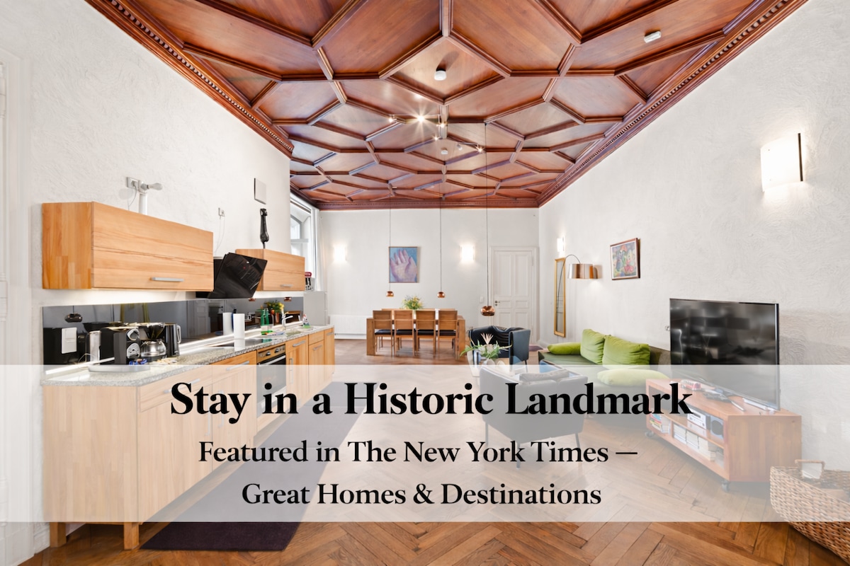 130 m² apartment with three bedrooms and two bathrooms, located in a historic Berlin landmark near Checkpoint Charlie. This is the only fully preserved historic landmark in central Berlin offering holiday apartments — and the only unit featuring the original wooden ceiling from 1895. Bright, spacious, exceptionally quiet, with modern comfort and a private balcony. U-Bahn, cafés and restaurants are just minutes away.