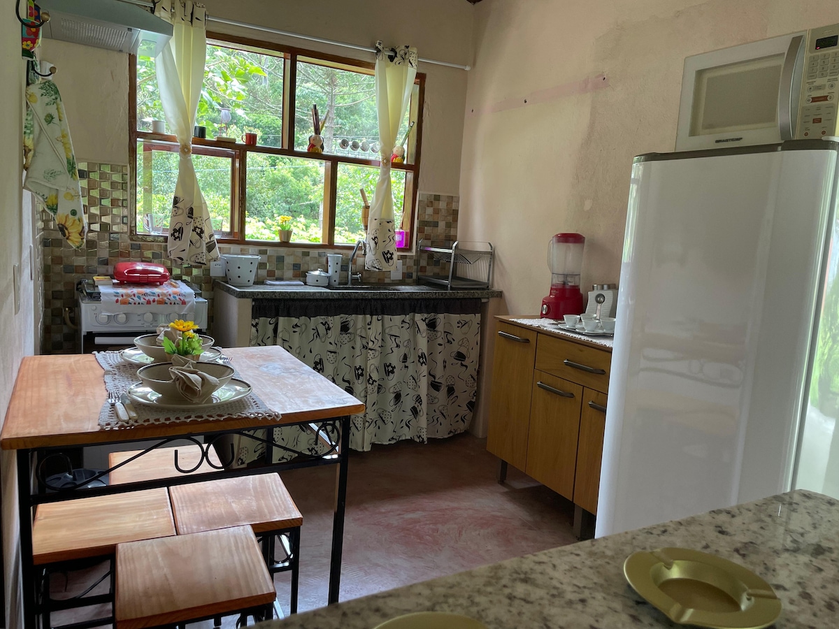Curta momentos de relaxamento total em Chalé no alto da montanha, ar puro e clima romântico. Confortável cama de casal, cozinha equipada, banheiro completo, ducha com aquecimento a gás. Local tranquilo, fora do "agito" da cidade, a 1,5km do centro comercial da cidade, A partir de Dezembro/2018 com a rua calçada, tornando o acesso tranquilo para todos os tipos de veículos.