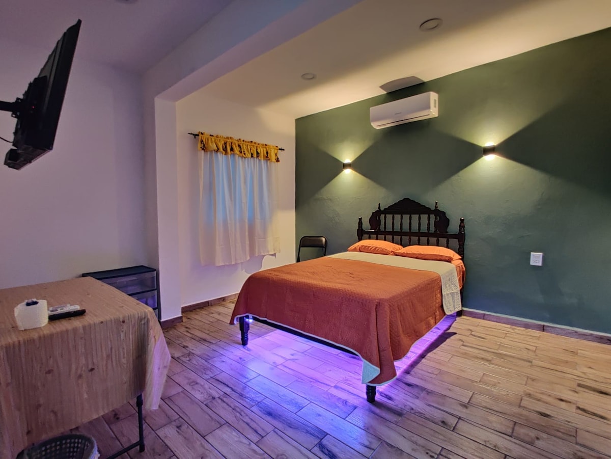 Disfruta de nuestra acogedora casa, su gran patio y su excelente ubicación en el centro de Juchitan. En un ambiente tranquilo y familiar. Ideal para parejas y personas que disfrutan la naturaleza y la arquitectura mexicana. Cuenta con baño privado en la habitación, sala con televisor y escritorio, una pequeña cocina con refrigerador y estufa y un hermoso corredor tradicional con vistas al patio. Pueden estacionar su vehículo dentro de la propiedad. Comparte patio con nuestra casa familiar.