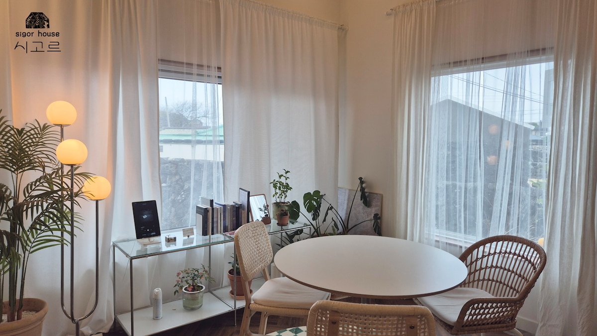 가볼 곳이 많은 동네 사계리에서 사계 바다로 가는 고요한 동네 길목에 놓인 세련된 감성의 숙소입니다. 세련된 인테리어 요소에 편리함과 편안함을 더했습니다. 안방에서 보이는 산방산과 돌담, 그 너머 보이는 고즈넉한 푸른 빛의 밭은 더할 나위 없이 평화로움을 선사하고 따뜻한 다도실은 밤에는 아늑한 극장으로 바뀝니다. 돌담 주방과 색상 포인트를 준 공간들 속에서 특별한 경험을 해보세요. 2025년부터 기존 가격을 낮추고 기존에 제공하던 웰컴키트를 제공하고 있지않습니다. 이 점 양해부탁드립니다. 인스타그램 : sigor_house