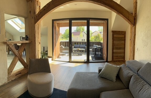 Роскошная квартира с видом на деревню и горы с собственной террасой. Большая двуспальная кровать, отдельная ванная комната с ванной и большим душем, оборудованная мини-кухня (кофемашина Nespresso, микроволновая печь и т. д.), диван-кровать для 2 человек, Wi-Fi, OLED-телевизор. Прачечная (стиральная машина, сушильная машина).