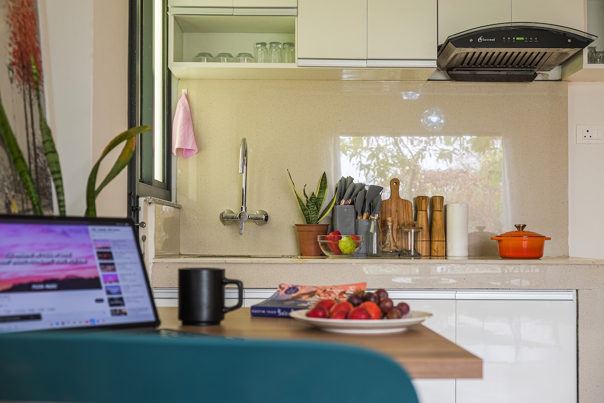 Современная КВАРТИРА Саалу состоит из высокого потолка, где солнечный свет попадает и освещает всю квартиру. Наслаждайтесь отдыхом в нашей просторной квартире, которая состоит из 1BHK с одной ДОПОЛНИТЕЛЬНОЙ бокс-комнатой, полностью оборудованной кухней, уличной мебелью и собственной крышей. Благодаря нашему роскошному интерьеру и полному уединению на верхнем этаже вы будете чувствовать себя как дома!