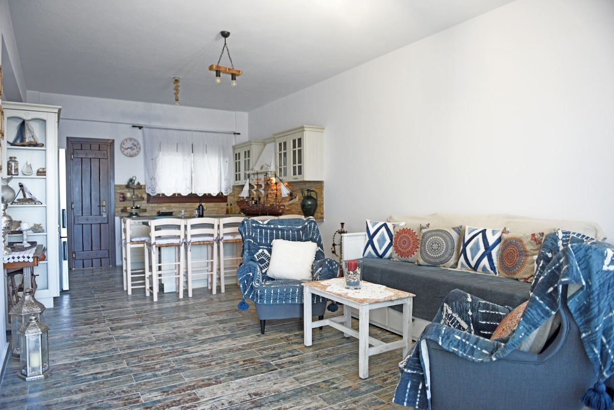 Недавно отремонтированная квартира-студия расположена в 50 метрах от моря с прекрасным видом и в тихом и спокойном месте, но недалеко от популярных пляжей и курортного города Арменистис. В более спокойные дни наслаждайтесь собственной тихой зоной для купания всего в двух минутах ходьбы от дома. Все остальные дни наслаждаются организованным пляжем всего в двух километрах. Рекомендуем взять напрокат автомобиль, чтобы покрыть огромные расстояния между достопримечательностями.