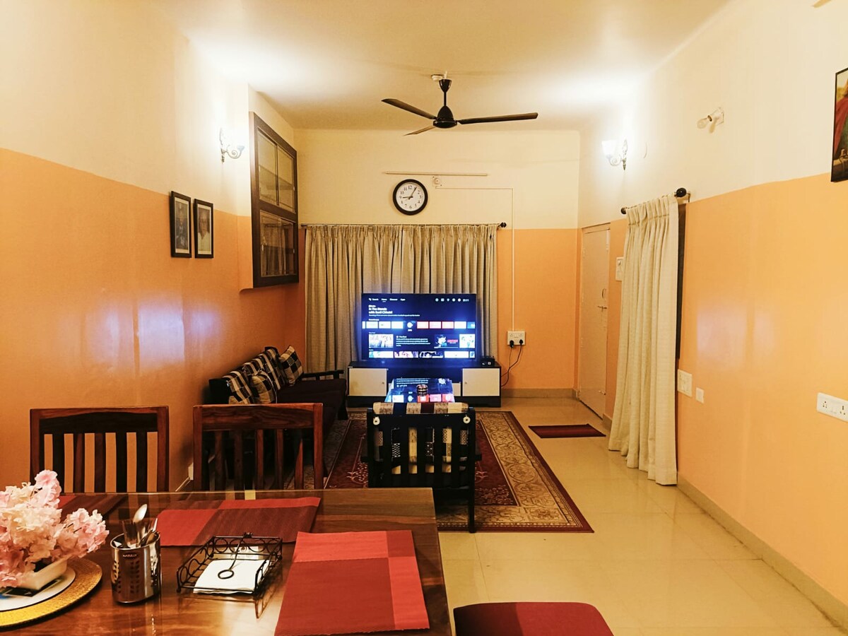 Отличное расположение — 1 км от NH44 в тихом районе с быстрым доступом к кольцевой дороге Ойтер (ORR), съезд 6. Рядом с колледжами, институтами, академиями, больницами, магазинами, ресторанами и развлечениями. Выезд: 9:00. Пожалуйста, оставьте квартиру чистой и опрятной. Вымойте использованную посуду перед выездом; помощь по уборке доступна за 100 индийских рупий в день (по желанию). Можно с животными! Не пускайте животных на кровати или диваны. Доступна кровать для домашних животных — просто спросите у сторожа.