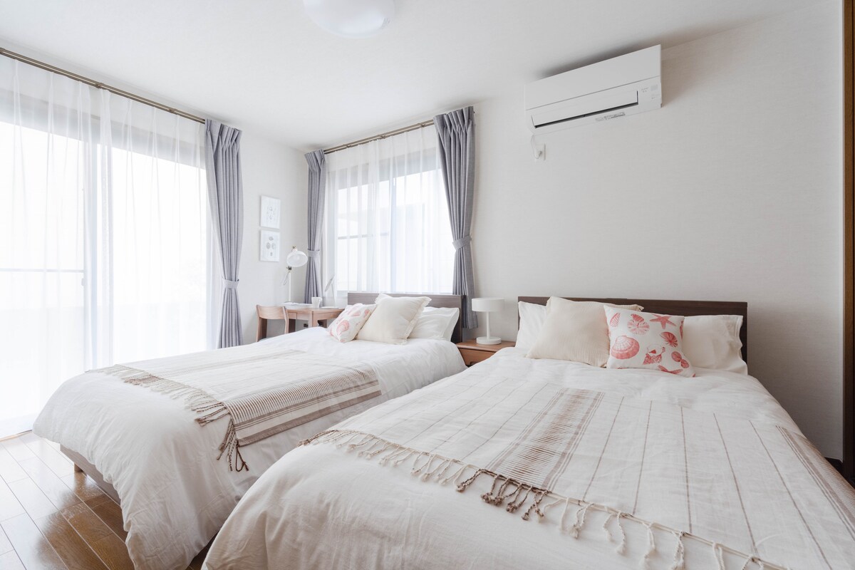 Новое объявление специальное! Добро пожаловать в Kala's Blue Crush! Остановитесь в спокойном прибрежном районе, известном пляжами, закатами, серфингом и местными кафе. Всего в 9 минутах от станции Кугенума-Кайган и всего в 1 остановке от Эносимы. Легко добраться на поезде до Камакуры и Иокогамы, и около 1 часа до центра Токио. В доме 5 спален, 2 туалета, 1 ванна/душ, полностью оборудованная кухня, обеденная и гостиная зона, Wi-Fi, кондиционер, парковка и многое другое — идеально подходит для отдыха на море.