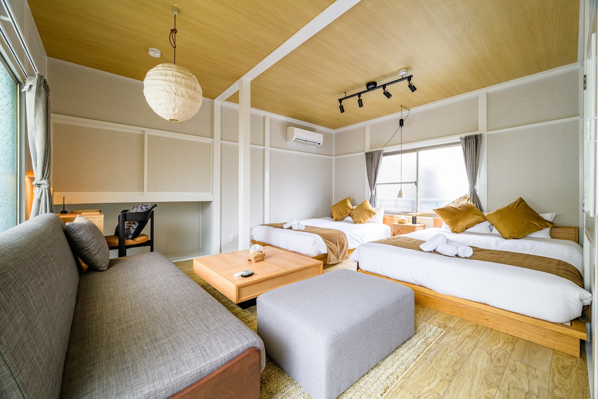 Отдохните в нашей просторной гостиной, обставленной натуральными, экологически чистыми материалами. Частная аренда включает в себя гостиную и 2 спальни — идеально подходит для 7 гостей. Всего в 15 минутах езды на поезде от аэропорта Ханэда, Синагавы или Иокогамы — идеально для путешествий по Японии! Всего в 30 секундах от квартиры: • Круглосуточный магазин. • Прачечная с оплатой монетами • Тренажерный зал. Идеально для длительного проживания. Нет лифта; доступ по широкой крытой наружной лестнице.