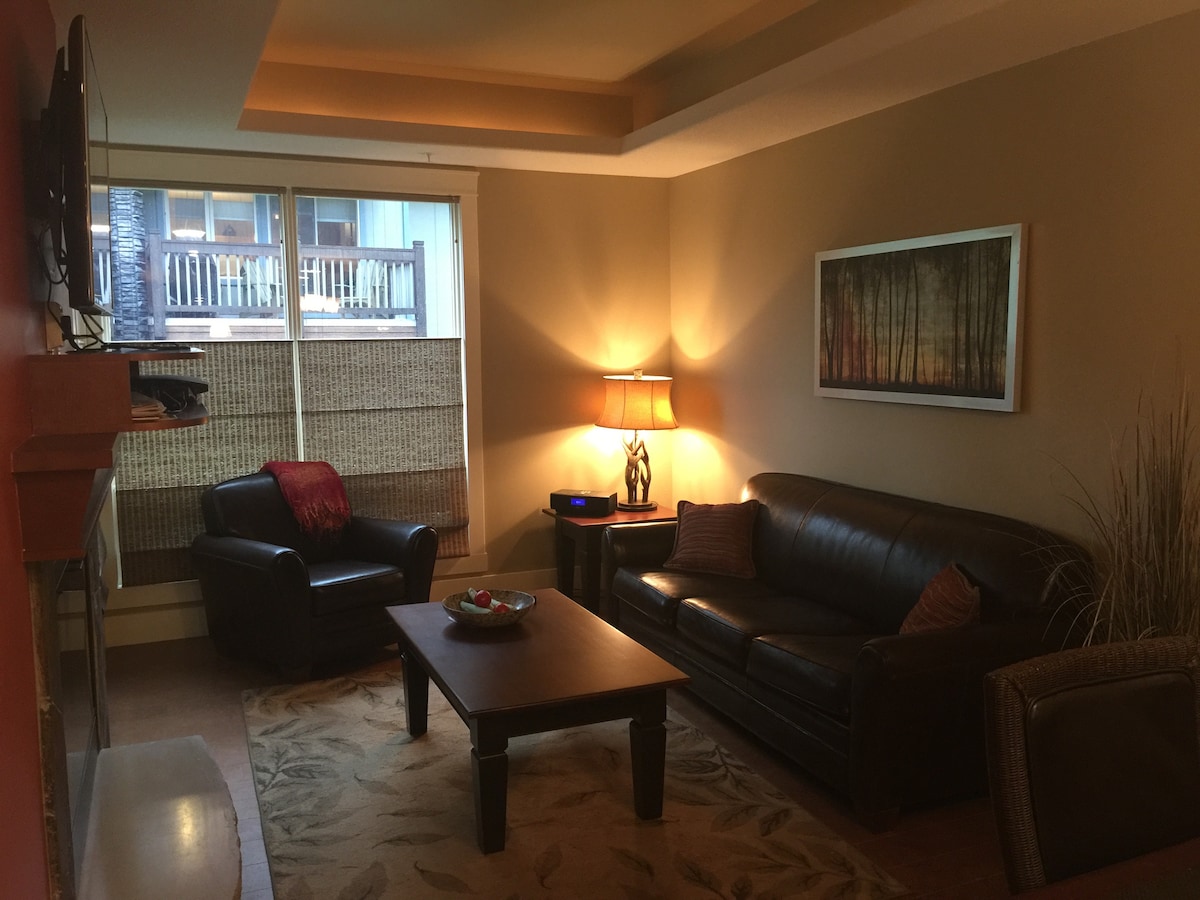 Уютный южный 1 кровать 1 ванная Кондо с видом на горы; в 10 минутах ходьбы от центра города; Недавно отремонтированный и полностью оборудованный с новой мебелью, кондиционером, 2 телевизорами с плоским экраном, высокоскоростным интернетом и многое другое. Выдвижной диван-кровать в гостиной для 3-го и 4-го человека. Подземная парковка; Гости могут пользоваться крытым бассейном рядом с горкой с водой, гидромассажными ваннами и тренажерным залом бесплатно. Деревянные полы, гранитные кухонные столешницы и газовый камин для ощущения гор. Палуба с барбекю и видом.