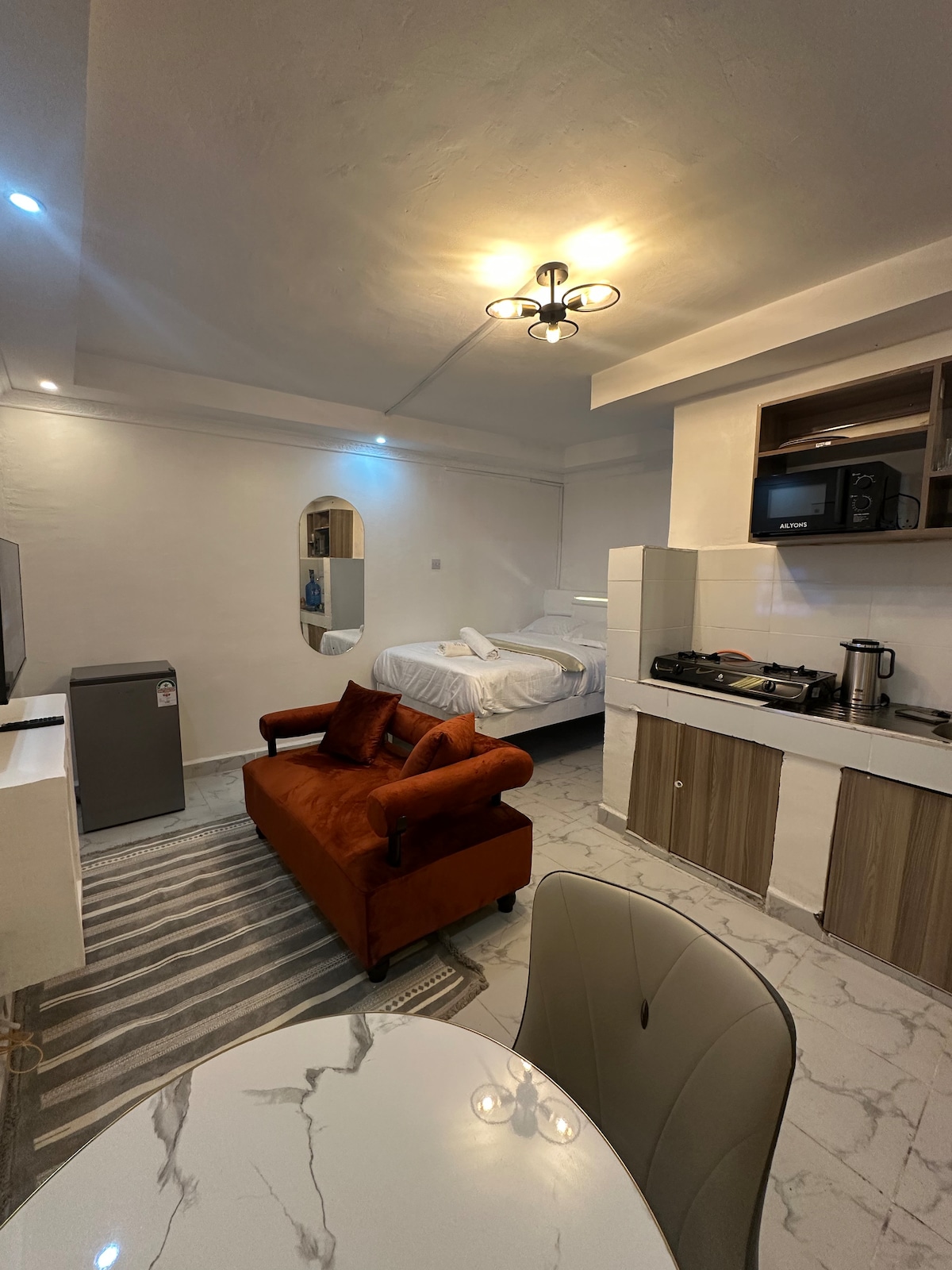 Отдохните в нашем современном оазисе с одной спальней, классической стеклянной перегородкой и открытой кухней, всего в 20 минутах от аэропорта. Насладитесь близлежащими достопримечательностями, такими как Найробийский национальный парк и Центр жирафов, а также Центром Яя и Дендрарием, расположенными рядом для шопинга и прогулок на природе. Квартира окружена лучшими больницами и ресторанами, предлагает круглосуточную охрану и тренажерный зал, идеально сочетая городской шарм с африканскими приключениями. Мы гарантируем круглосуточное электроснабжение от нашего резервного генератора в случае отключения электроэнергии.
