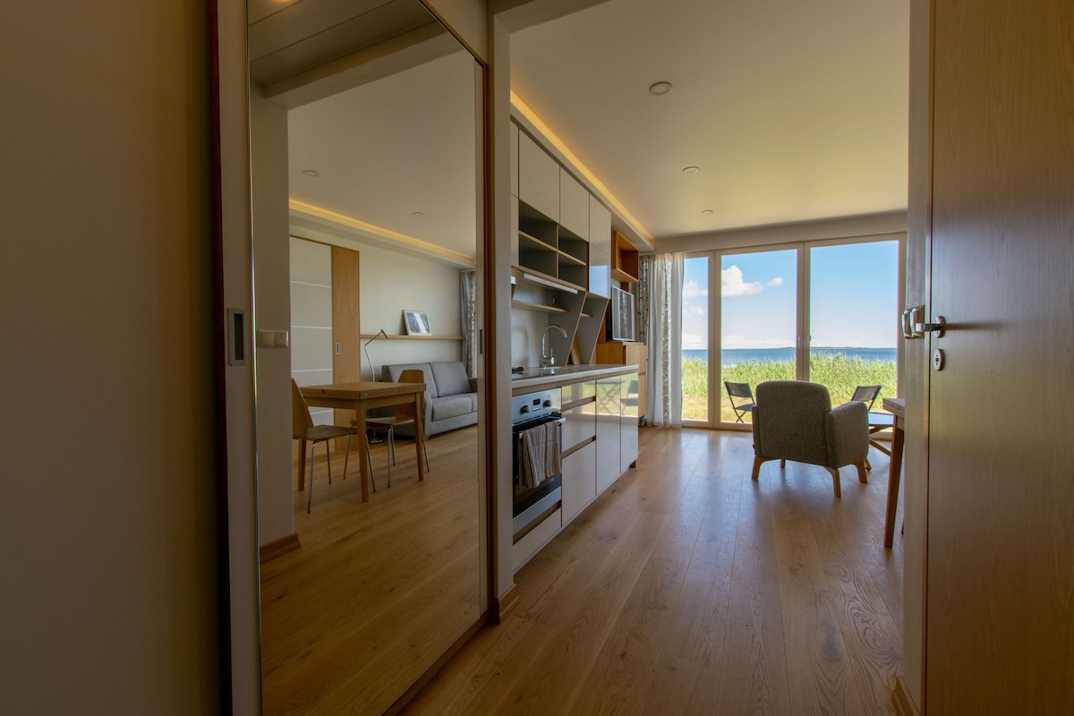 Our small house is located in the private harbor of Ruhve.The 180-degree view of the sea offers wonderful emotions,peace and a perfect opportunity to switch off from everyday life. The house has double bed,a sofa that folds out, a kitchenette,a toilet and a shower.There house is also equipped with Wi-Fi and air conditioning. The price includes the possibility of using a sauna with sea view. For an additional fee,it is also possible to use a hot tub and two SUP boards.