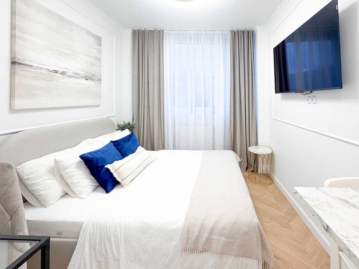Two-room comfortable, air-conditioned apartment (45 m2) designed by an architectural firm in a modern boho style 🏡 - Bedroom with a double bed & designated workspace - Living room with a double sofa - Kitchenette with all the essentials including coffee machine & milk frother so that you can have your morning cappuccino - Bathroom with a shower, bidet, washing & drying machine and all the bath essentials - Balcony - 600 Mb/s Wi-Fi - Free parking space in the underground garage