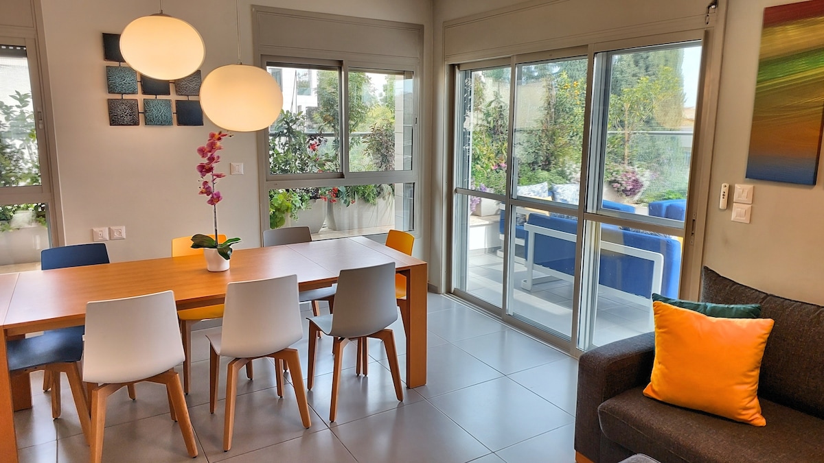 Красивая квартира с 3 кроватями/2 ванными в нескольких шагах от кафе, парков, магазинов, продуктовых магазинов, почтовых отделений. Комфортное размещение 8 человек. Стиральная машина/сушилка, кабельное телевидение, Wi-Fi, кондиционер. Полностью оборудованная кухня. Просторный; с террасой/балконом. 1-й этаж; лифт, одно выделенное парковочное место. Рядом с транспортом (поезд, автобус, такси). Легко добраться до Тель-Авива, Иерусалима, Хайфы по близлежащему маршруту 6.