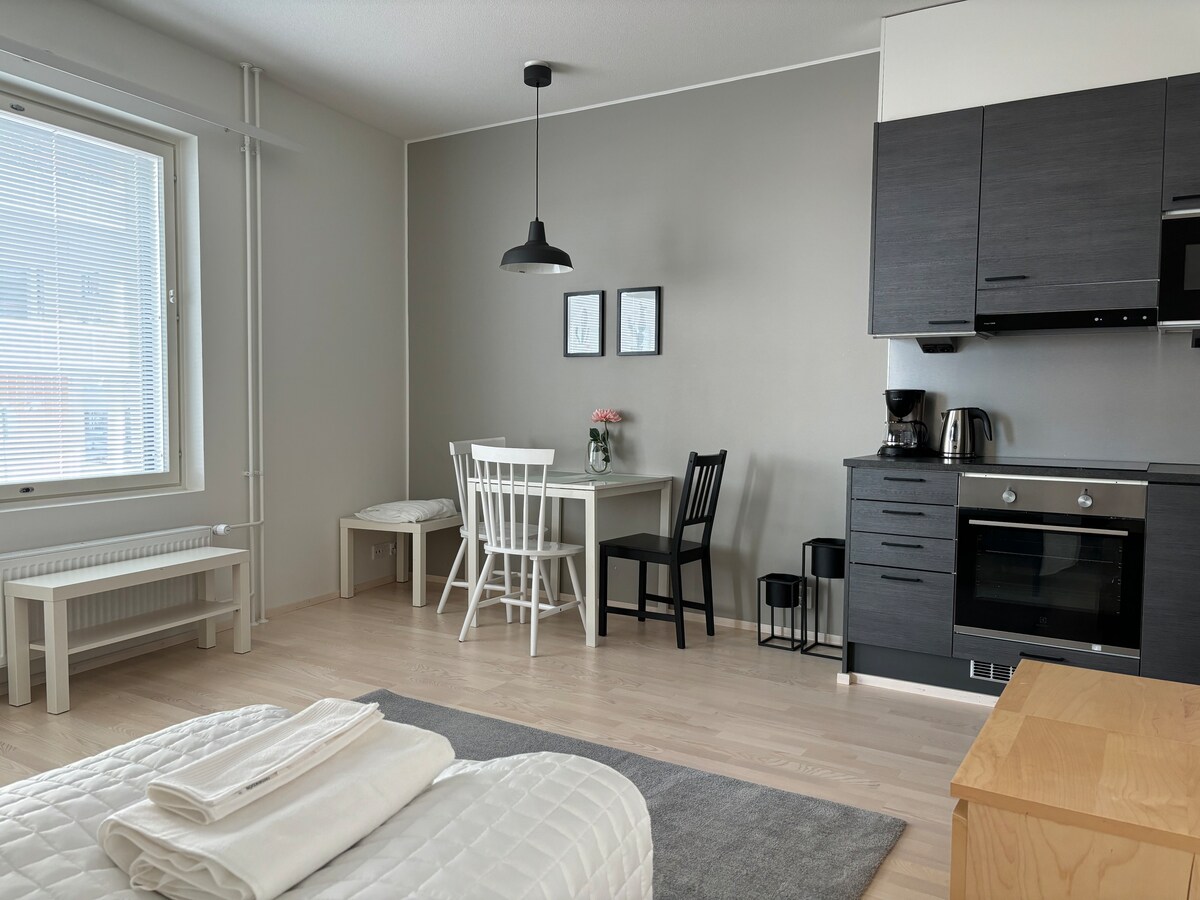 **Уютная скандинавская квартира в центре Рованиеми** Просторная и светлая квартира с 3 кроватями, хорошо оборудованной кухней и ванной комнатой с душем, туалетом и подогревом пола. Жилье расположено в центре Рованиеми, всего в 300 метрах от реки Кемийоки, идеально подходит для наслаждения магией Лапландии: от северного сияния до свежего зимнего воздуха. Магазины, рестораны и услуги находятся в нескольких шагах, рядом удобная уличная парковка. Общественная парковка. Wi-Fi включен.
