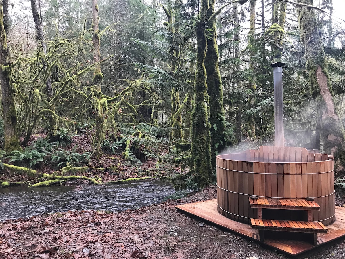 Это поистине уникальный домик. Он, спроектированный архитектором Дэвидом Нейманом в книге «Log Houses of the World», сочетает в себе элементы японского стиля и строительство бревенчатого каркаса на северо-западе, чтобы создать поистине уникальный опыт. В стоимость аренды входит использование лесистой территории площадью более 13 акров, включая доступ к средней развилке реки Нуксак. Хижина находится недалеко от круглогодичных мест отдыха на открытом воздухе, которые предоставляет национальный заповедник Маунт-Бейкер-Сноквалми.