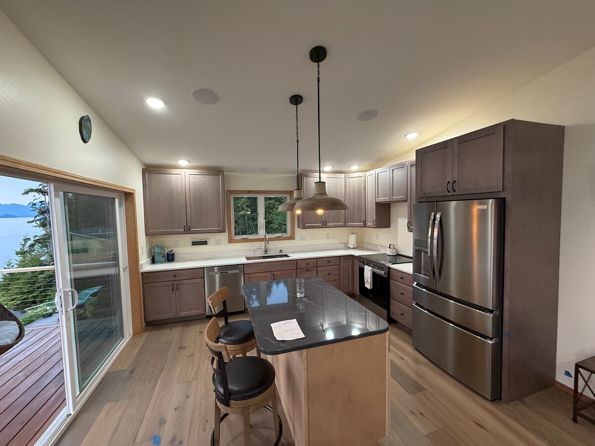 Ocean views with sunrise & set moments. You'll find comfort & style, w/ new flooring and high-end furniture. Sleep in comfort & wake up fresh, ready to embark on your Alaskan adventure. Our covered patio, offers breathtaking scenery, rain or shine. From coffee to cocktails, this private space is perfect to unwind & soak up your surroundings. It's a quick walk to nightlife, restaurants, & bustling docks. Immerse yourself in the local culture and culinary delights just steps from your door.