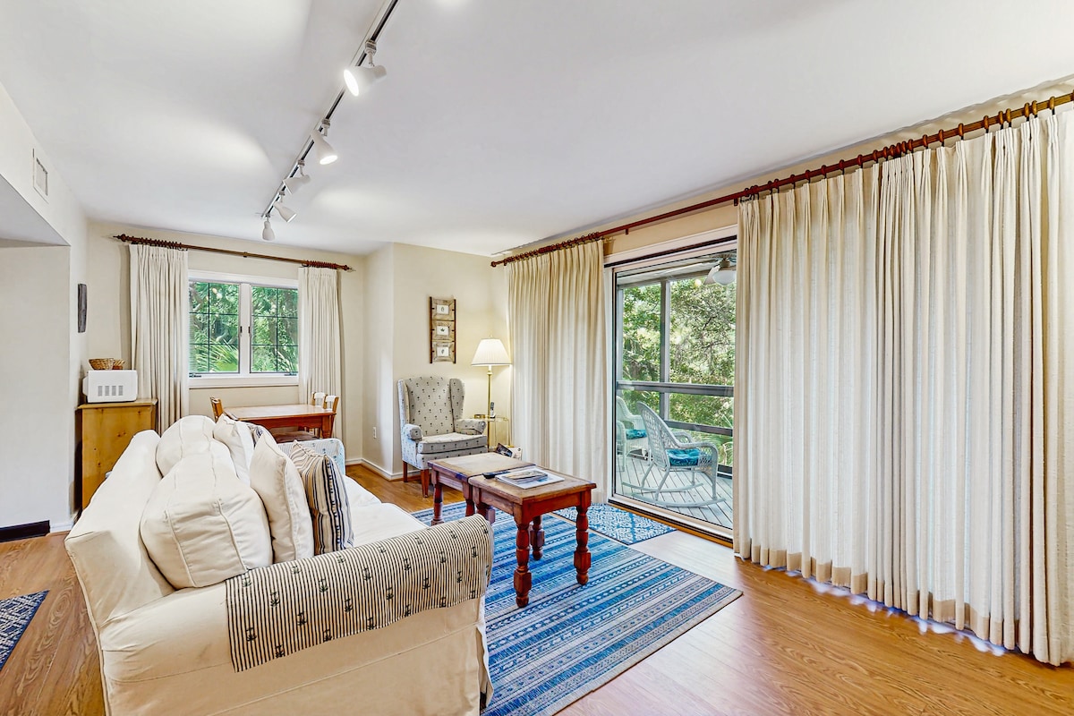 Вилла Kiawah на втором этаже, недалеко от пляжа (менее 3 минут ходьбы) без дорог для пересечения, недалеко от всего. Обновлено. Идеально для пар, ищущих спокойный пляж. Диван-кровать для детей. Крыльцо с видом на морской лес. Наблюдайте за оленями, бродящими и слушайте пение птиц. Отличное место для пробежки на рассвете или прогулки по пляжу с чашкой кофе. В нашем кондоминиуме могут с комфортом разместиться 3 взрослых или 2 взрослых и 2 детей младше 12 лет.