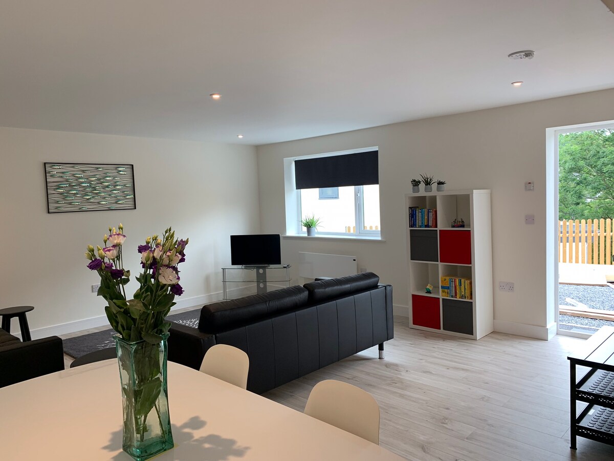 Всего в 5 минутах ходьбы от центра города, недавно построенного жилья, вмещает до 4 человек. Парковка на 1 автомобиль, 2 по запросу. Прекрасный дом с 2 спальнями, очень хорошо оборудованный и выполненный по высоким стандартам. В нем есть современная гостиная открытой планировки и 2 спальни. 1 спальня с двуспальной кроватью размера King size, а другая — открытой планировки на лестничной площадке с 2 односпальными кроватями, идеально подходит для детей и подростков. Возможны короткие перерывы на 2 ночи, но в основные школьные каникулы требуется 7 ночей. НИКАКИХ ДОМАШНИХ ЖИВОТНЫХ. Если у вас остались вопросы, просто задайте их