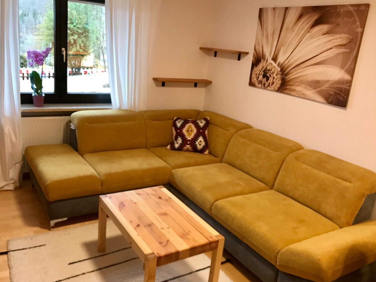 Добро пожаловать в нашу недавно отремонтированную, очаровательную квартиру площадью 80 кв. м, в тихой и живописной сельской местности Хохенштайн. Если вы хотите уютного и спокойного отдыха, это идеальное место. 2 уютные спальни с кроватями размера Queen size, а также жилой район с диваном-кроватью приглашают на уютный отдых. Благодаря своему расположению квартира предлагает легкий доступ к мероприятиям на свежем воздухе, таким как пешие прогулки, катание на каноэ, верховая езда и знакомство с ландшафтом.