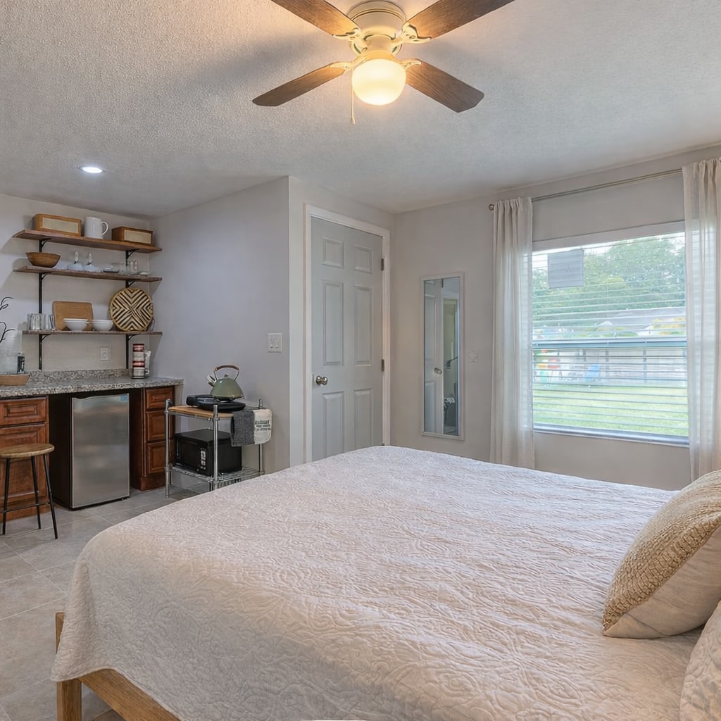 Добро пожаловать в Орландо! Это место идеально подходит для вас. У вас будет собственная ванная комната, мини-кухня, кондиционер, патио и частный вход. Курение внутри запрещено, но у вас будет место для курения. Комфортная и уютная студия, вы будете чувствовать себя как дома. Время заезда гибкое, выезд в 10:00, если вы уезжаете в 10:05 или вам нужно дополнительное время, взимается плата в размере 10 долларов в час