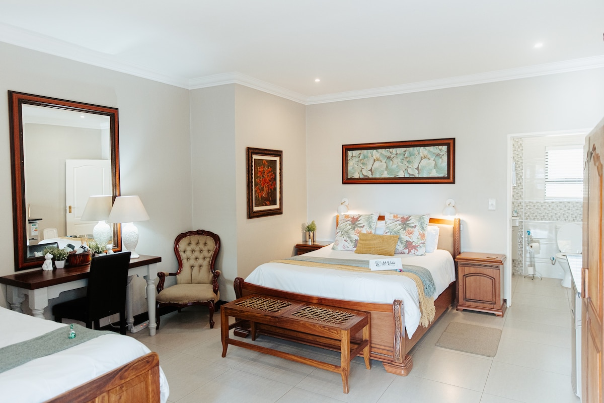 Family Room with either King size or three twin beds and en-suite bathroom - shower only. Equipped with microwave oven, fridge, desk, DStv and hair dryer, crockery, tea and coffee. Private entrance to garden and pool.