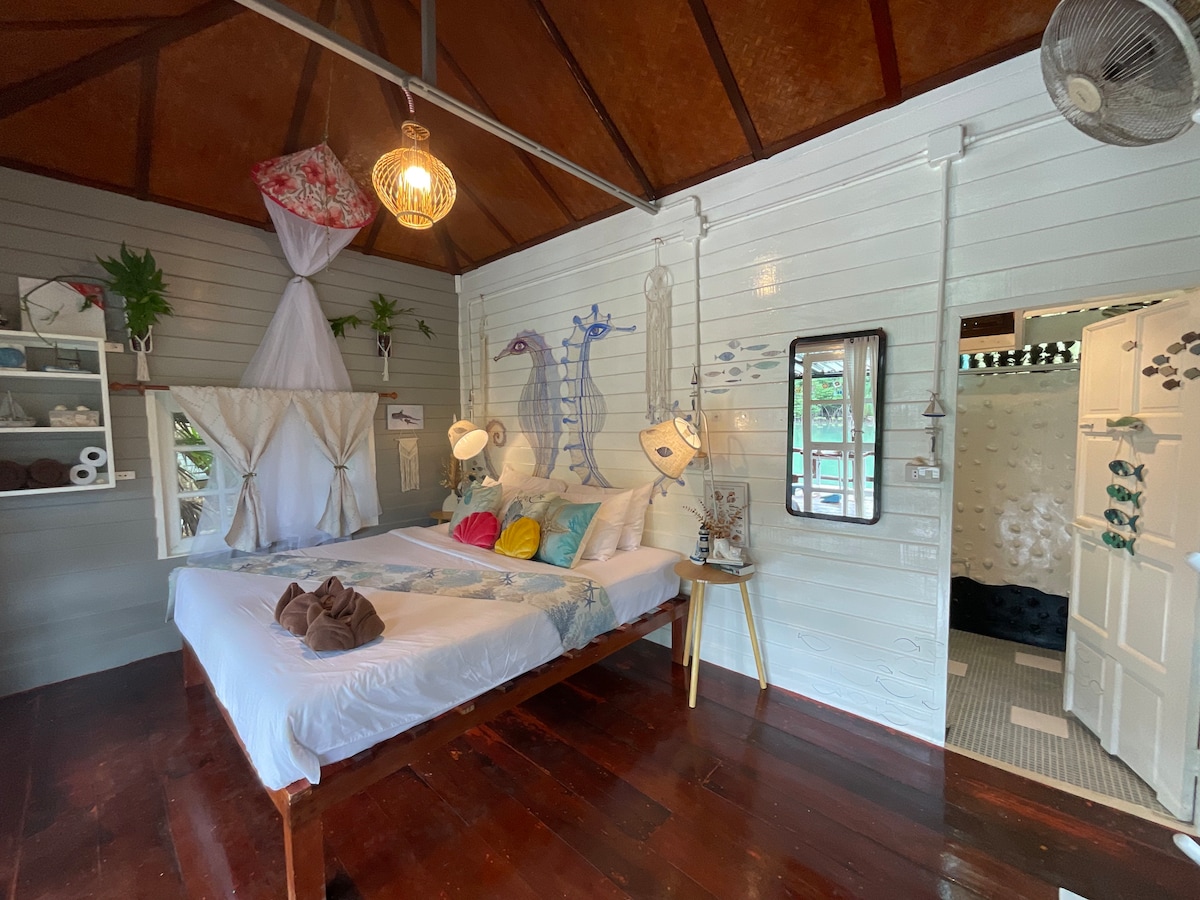 Комфортабельное бунгало расположено на тихом курорте, в саду в Клонг-Прао, в 200 метрах от пляжа и в 200 метрах от главной дороги. Кондиционер, холодильник, собственная ванная комната с горячим душем, хороший Wi-Fi, телевизор с Netflix. Наши гости могут пользоваться общей оборудованной кухней за пределами нашей стойки регистрации. Уборка по требованию бесплатно.