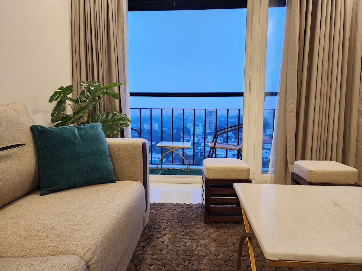 Добро пожаловать в Canopy! Тихий дом площадью 770 кв. футов в Кочи, оформленный в зеленых тонах и с тематикой птиц, где городские удобства сочетаются с умиротворяющей природой. Просыпайтесь под пение птиц, наслаждайтесь закатами с балкона и отдыхайте в нашем спокойном, уютном жилье! Удобства и удобства: • Гостиная с балконом, спальня и ванная комната. • Кондиционер, 55-дюймовый телевизор, стиральная машина. • Рабочий стол с Wi-Fi. Близость: • Центральное расположение рядом с кафе и магазинами. • 4 км до Инфопарка и больницы Санрайз. • 45–50 минут от аэропорта. • 30–35 минут до железнодорожных вокзалов.