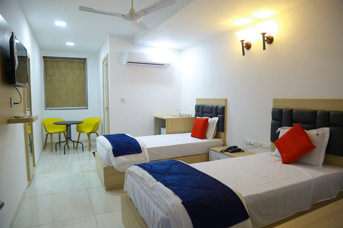 Experience luxury and comfort in our Executive Suite in Hyderabad, This elegantly furnished suite features a spacious bedroom, modern ensuite bathroom, high-speed Wi-Fi, air conditioning, and a dedicated work desk. Located in a prime area with easy access to IT hubs, shopping centers, and restaurants, it offers both convenience and class. Enjoy daily housekeeping, 24/7 security, and a peaceful environment ideal for work or relaxation.