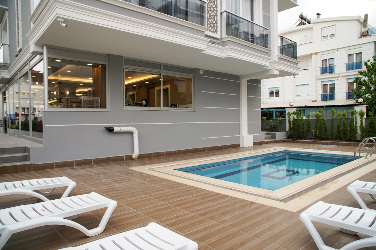Апартаменты с американской кухней 1+1 в стиле Retro Star, вместимостью до 3 взрослых и 1 ребенка, в пешей доступности от пляжа Коньяалты и общественного транспорта в районе Коньяалты в Анталии, бассейн, бесплатный Wi-Fi, рядом с ресторанами и развлекательными заведениями, центральное расположение. В отеле есть бесплатная стиральная машина для гостей.