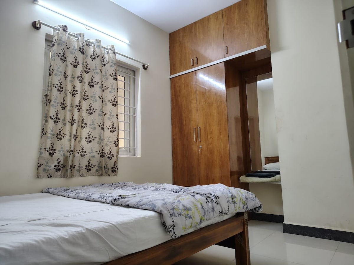 Это простой дом 1BHK, расположенный в тихом районе, который идеально подходит для уютного и расслабляющего отдыха. Благодаря спокойному окружению в превосходном месте (BTM) в Бангалоре отсюда легко добраться до торговых центров, визового офиса, супермаркета, пивоварни и ресторанов, больниц, библиотеки и автобусных остановок. Удобства - 43-дюймовый телевизор Ultra HD Smart TV. - Солнечный гейзер. - Высокоскоростной Wi-Fi. - микроволновая печь; - Кондиционер. - Кухня с газовой плитой и посудой. - Холодильник. - фильтр для воды; - Диван. - Кровать размера Queen size. - Шкаф и т. д.