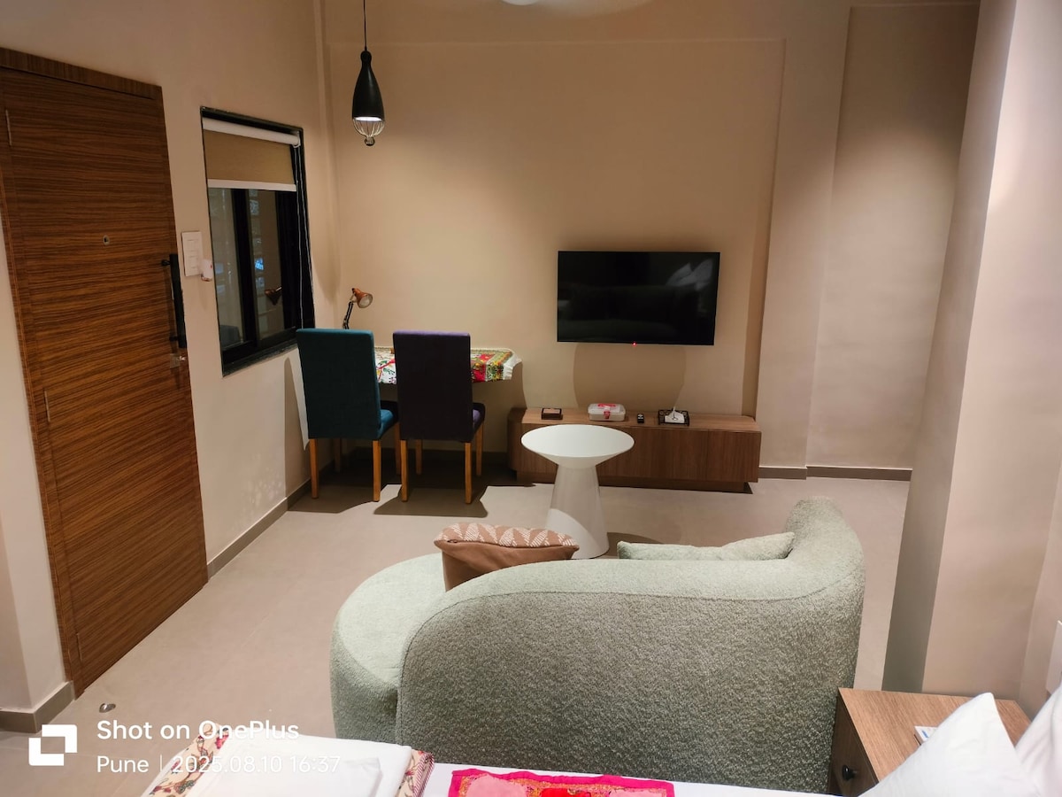 Escape to this peaceful, modern studio in the heart of Koregaon Park. Perfect for 2 guests, this central retreat offers a fully equipped kitchenette, dedicated workspace, and AC. Ideal for both work and leisure, enjoy the convenience of a prime location with all the comforts of home. Your simple, comfortable, and convenient stay in Pune awaits.