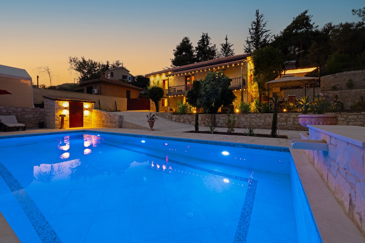 Очаровательный роскошный загородный дом — ваш идеальный отдых! Отдохните в тихой деревне, окруженной природой и полной уединенностью. Дом полностью оборудован. — Пышный сад с разнообразными фруктовыми деревьями. — Сауна на открытом воздухе и холодное джакузи. — Уютная углубленная зона отдыха вокруг костра. — Естественный ручей, протекающий через сад. — Открытый вид на горы. — Всего в нескольких минутах от потрясающих гор Троодос. Идеально подходит для тех, кто ищет тишины, комфорта и связи с природой.
