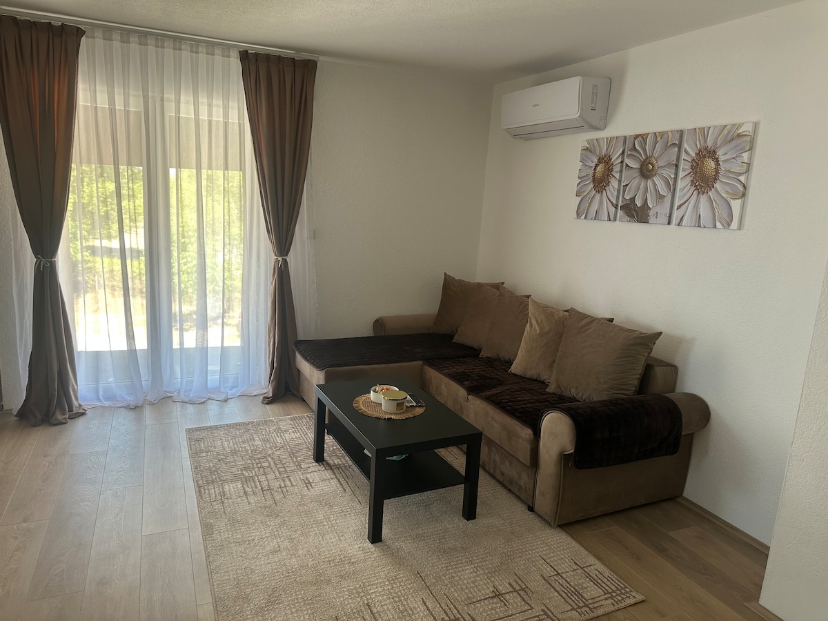 Kick back and relax in this calm, stylish space. New cozy apartment 53m2 locate in Petrovec.Near the airport of Skopje, close to the highway towards Greece. There is bedroom with a double bad and living room with a sofa bed and fully equipped kitchen.Bath and shower shampoos, towels and linens are also available. The ground floor of the building is a supermarket.Aeound the apartment are many fast food, restaurants, hospital, pharmacy, ATM and bus stop in front of the apartment.
