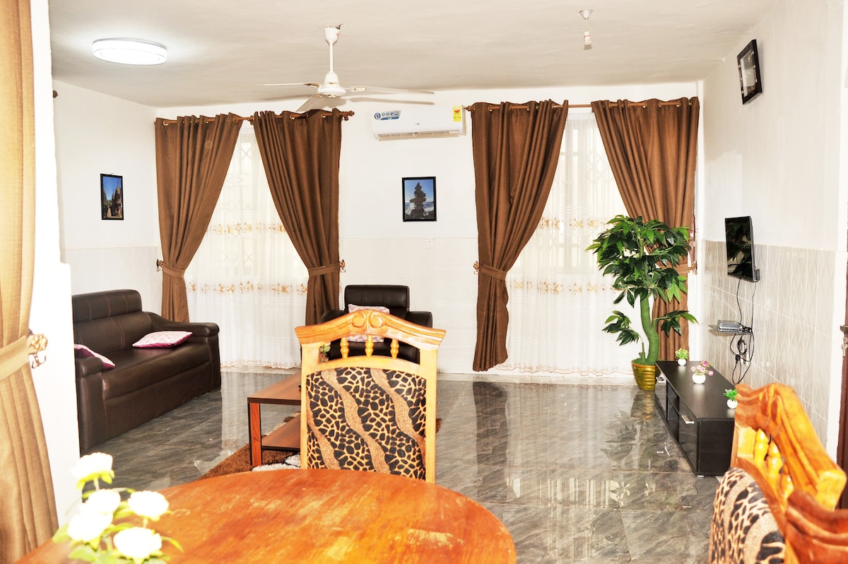 - 3 спальни и 2 ванные комнаты (1 отдельная ванная комната, 1 основная). - Гостиная с 55-дюймовым телевизором. - Полностью оборудованная кухня (включая стиральную машину); - Горячая вода - Обеденная зона. - Отдельный вход - зона барбекю/гриль - Высокоскоростной Wi-Fi - Бесплатная парковка (до 3-4 автомобилей; - камеры видеонаблюдения и электрическое ограждение для вашей безопасности. - Бесплатная уборка при необходимости. - Самостоятельное прибытие с нашим круглосуточным смотрителем. * ПРЕДОСТАВЛЯЕТСЯ ГЕНЕРАТОР ДЛЯ ОТКЛЮЧЕНИЯ ЭЛЕКТРОЭНЕРГИИ. Идеально подходит для семей, туристов и деловых путешественников!