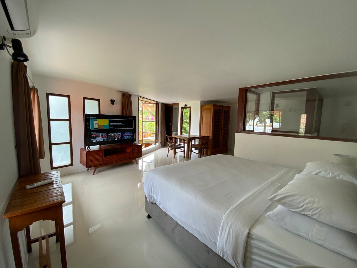 Откройте для себя современное и комфортабельное жилье в тихом месте с просторными номерами с собственными террасами и освежающим бассейном. Идеальное расположение в нескольких минутах ходьбы от самых знаковых мест Бали — пляжей Дримленд, Меласти и культурного парка Гаруда-Вишну-Кенчана (GWK). Наслаждайтесь бесплатным высокоскоростным Wi-Fi, круглосуточным видеонаблюдением, чтобы чувствовать себя в безопасности и комфорте. Будь то отпуск или длительное пребывание, мы будем рады принять вас!