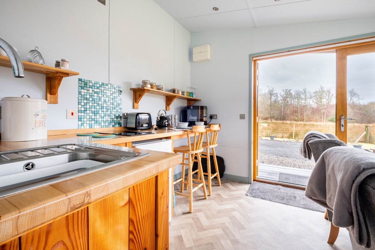 Red Fox Retreat - это роскошное место для глэмпинга. Хижина, расположенная на более традиционной «капсуле», имеет изогнутый деревянный интерьер, входящий из арочного дверного проема, перед которым расположена идеально оборудованная двуспальная кровать размера King size с потрясающим видом на Троттениш-Ридж и сельскохозяйственные угодья, окружающие жилье. Это тепло и уютно для защиты от стихии, но в то же время светлое и просторное жилье. В хижину можно попасть через впечатляющую большую крытую террасу.
