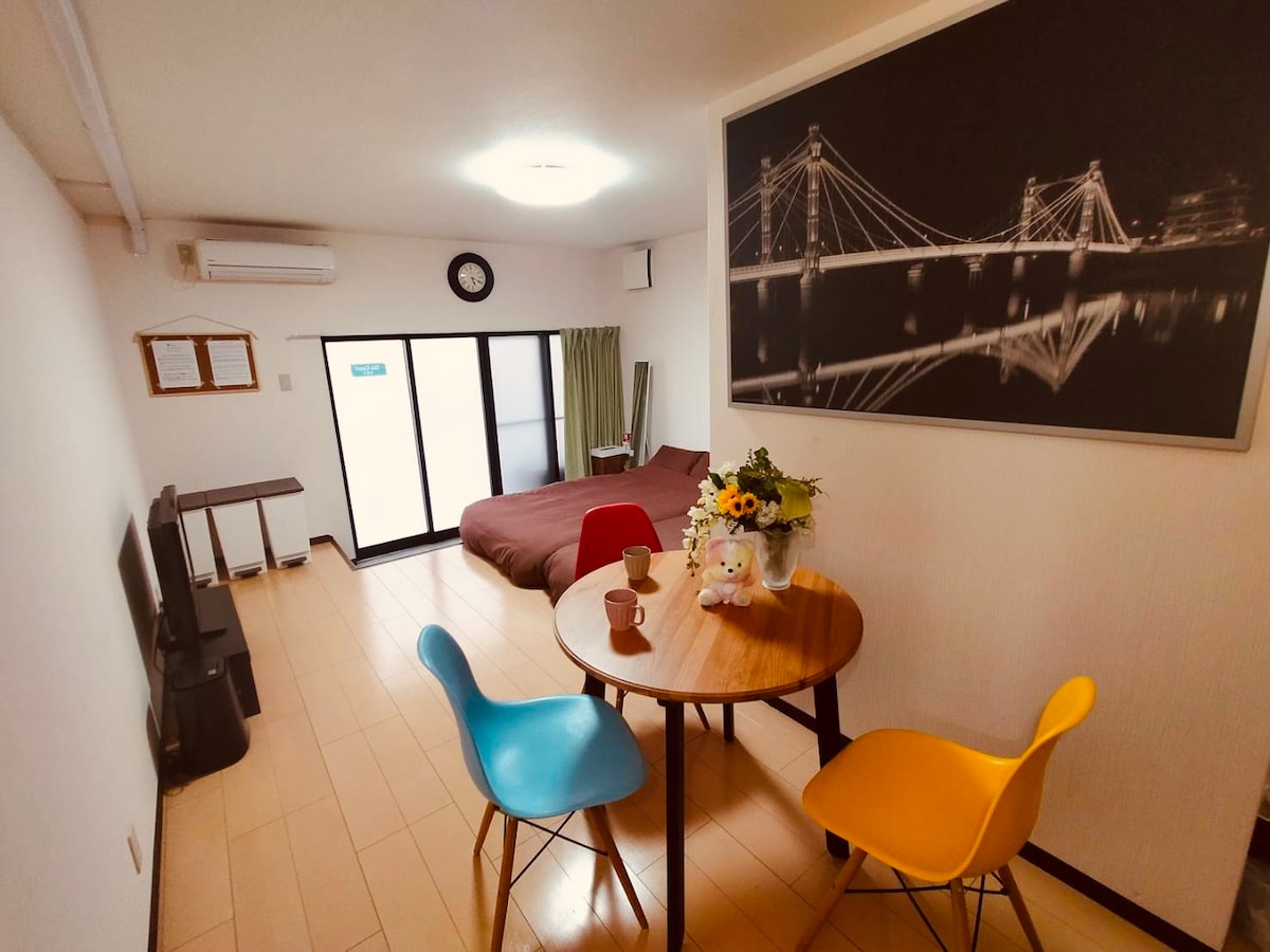 7 минут на поезде до Universal Studios Japan! Жилье находится в очень удобном месте, всего в 5 минутах ходьбы от ближайшей станции Chidori-bashi 【Sta.】 Мы отремонтировали таунхаус для семей, также предоставляем детские игрушки, книжки с картинками и т. д. Рядом есть торговые улицы, супермаркеты и множество ресторанов, что делает его очень удобным для долгосрочного проживания. До станций Намба, Дотонбори и Осаки можно доехать на прямом поезде за 10 минут, а до Нары и Кобе можно доехать на прямом поезде.