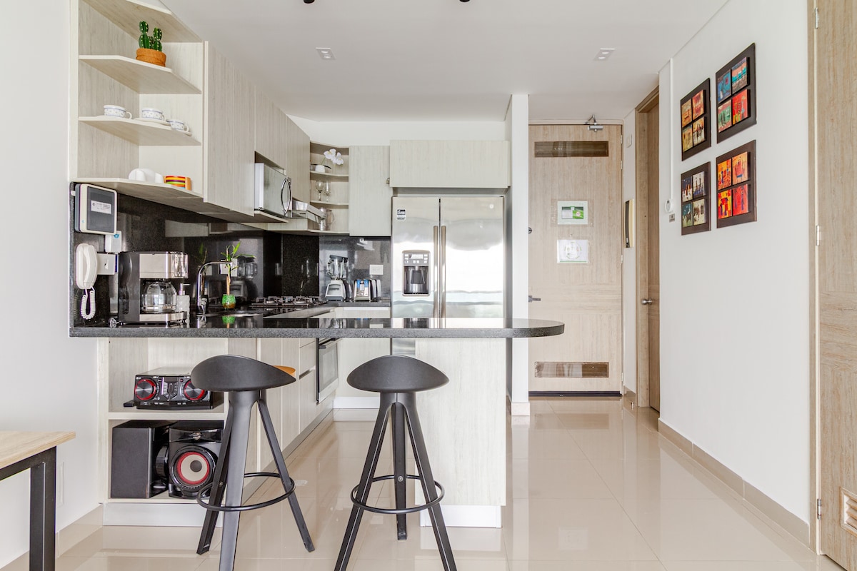 Disfruta de Cartagena en este acogedor apartamento ubicado en el sector de Morros, en el edificio Seaway 935, dentro del hotel Sonesta Hotel Cartagena. El edificio cuenta con acceso directo a la playa. Se encuentra a solo 10 minutos del aeropuerto internacional Rafael Núñez, a 15 minutos del centro histórico y ciudad amurallada y a 5 minutos del centro de convenciones de las Américas en auto. Al registrarse se debe cancelar una manilla de $10.000 pesos colombianos por persona R.N.T 141800